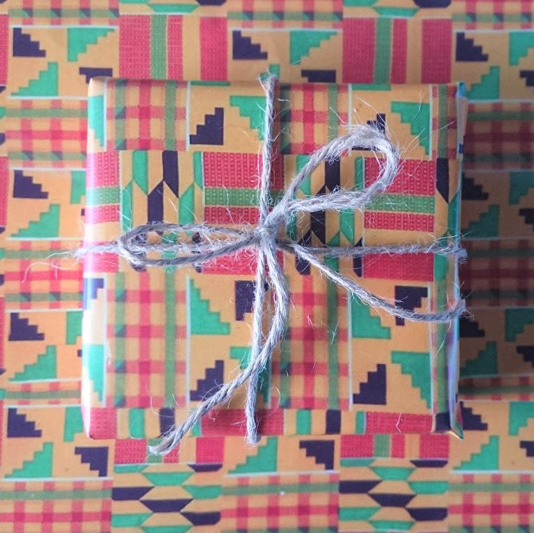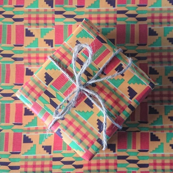 Traditionally worn by royalty for special ceremonies, the varied designs and meanings of kente cloth from Ghana have become synonymous with representations of African cultural wear. Our bright and colourful kente cloth style gift wrap is ideal for all occasions.